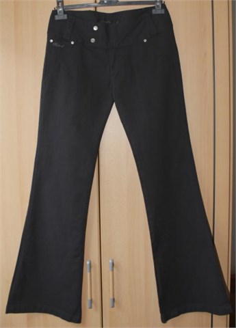 Potpuno nove, još uvijek sa etiketom. Niži struk, materijal je kao tanji traper. Prednji cif i kopčanje, široka pasica za remen. Nemaju džepova. Sa stražnje strane natpis od tamno sivog konca. Malo rastezljive. Nogavice se pri dnu malo šire (blagi trapez).