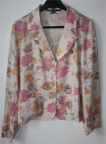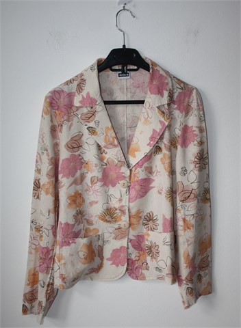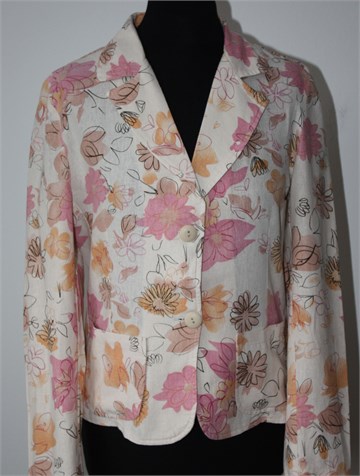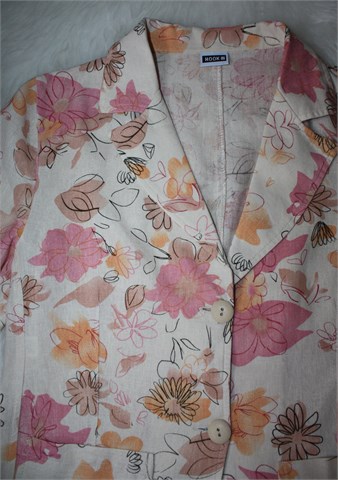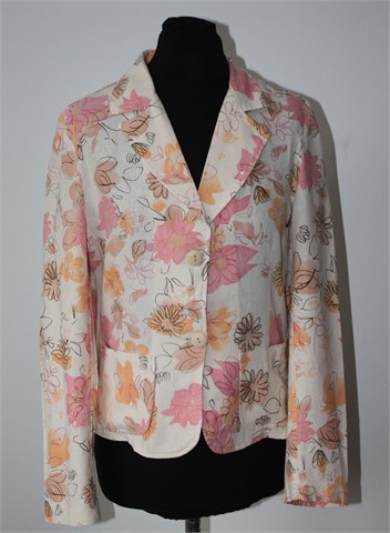 Hook sako/blazer od lana, podloga je prljavo bijele/svijetlo bež boje sa cvjetnim printom (boje i uzorci vidljivi na slikama).  Prednje kopčanje sa dva gumba, bočni džepovi. Prednji i stražnji ušitci (blago strukiran).