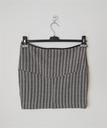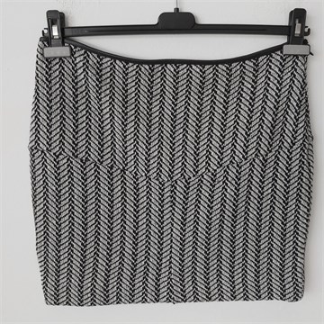 Hoss Intropia pletena suknja u kombinaciji crne i bijele boje, sa uzorkom na materijalu (vidljivo na slikama). Bočni cif i kopčica, na pasici je našivena ukrasna traka od umjetne kože/skaja. Podstavljena, rastezljiva.