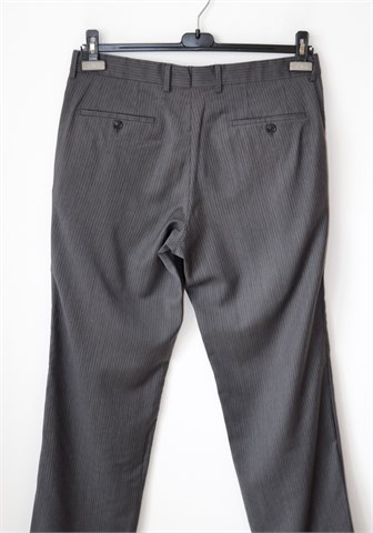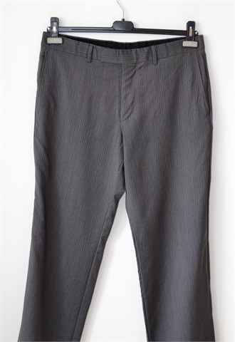 Hugo Boss hlače klasičnog kroja, sive boje sa svijetlim prugama. Prednji cif i kopčanje, uska pasica za remen. Prednji bočni, stražnji skriveni džepovi sa gumbom. Tanke i lagane. Podstavljene nogavice (samo sa prednje strane, do cca ispod koljena).