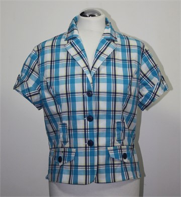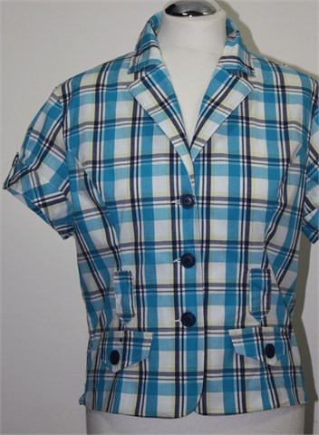 I.Q. Authentic Brand sako/jaknica sa kratkim rukavima, bijele boje sa plavim i žutim prugastim uzorkom (boje i uzorak kao na slikama). Prednje kopčanje i ukrasni džepovi, pasica za remen (bez remena). Prednji i stražnji ušitci (strukirana). Mekan, tanak i blago rastezljiv materijal.