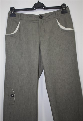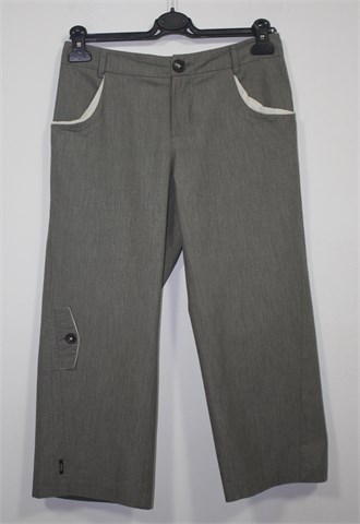 IKKS poluduge hlače smeže-bež boje sa sitnim prugastim uzorkom pa djeluju prošarane boje. Prednji cif i kopčanje, pasica za remen. Prednji džepovi, jedan stražnji na preklop sa gumbićem. Lažni džepić na desnoj nogavici i "kožni" ukras sa stražnje strane pasice.