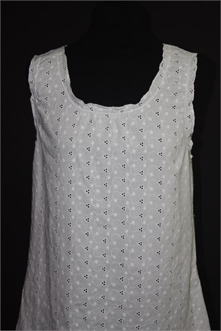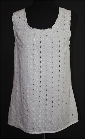 Iana košulja bez rukava, bijele boje sa cvjetnim uzorkom na tkanini. Bočni cif, mali bočni rasporci. Lagan i prozračan pamuk.