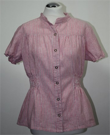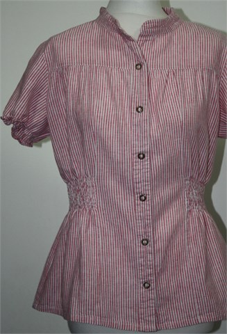 Ichi košulja sa kratkim rukavima, bijele boje sa crveno-rozim prugama. Blago stegnuta gumicom na kraju svakog rukava, prednje kopčanje sa drukerima. Bočno i sa stražnje strane stegnuta gumicama (što vizualno stanjuje struk) :) Čvrst ali prozračan materijal.