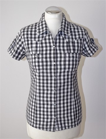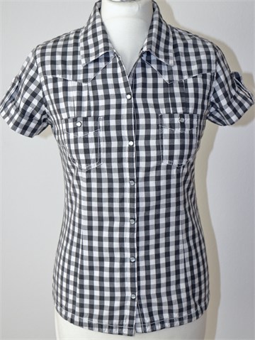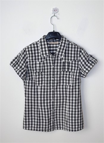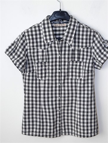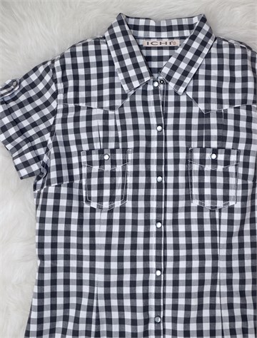 Ichi košulja sa kratkim rukavima, kockasta kombinacija crno/sive i bijele boje. Prednje kopčanje sa sedefastim ukrasnim drukerima, mali džepići na prsima. Strukirana, nije rastezljiva. Lagan i čvrst pamuk.