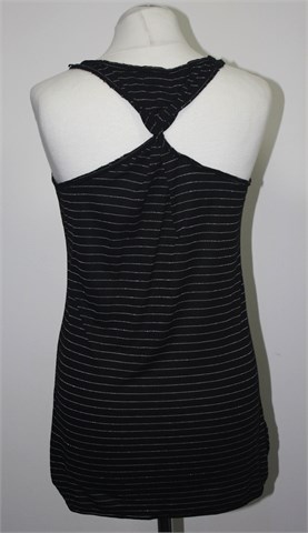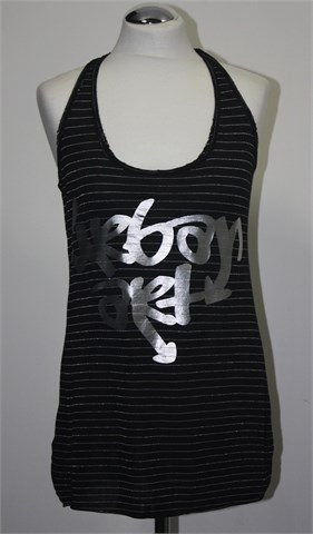 Ichi majica bez rukava/topić crne boje sa srebrnim prugama i prednjim srebrnim printom (natpis Urban art). Blagi bočni nabori, tvornički neporubljeni šavovi. Naramenice se na leđima obrnuto križaju (vidljivo na slici). Tanji i rastezljiv materijal.