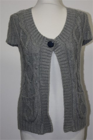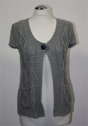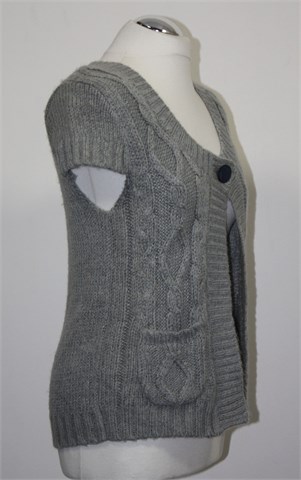 Ici et Maintenant vesta/kardigan sa kratkim rukavima, sive boje. Uzorak pletenica sa prednje strane, kopčanje sa jednim gumbom-drukerom (s unutarnje strane je druker a sa vanjske ukrasni gumb). Mekano, mucasto i rastezljivo pletivo, srednje debljine.