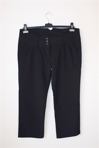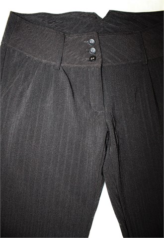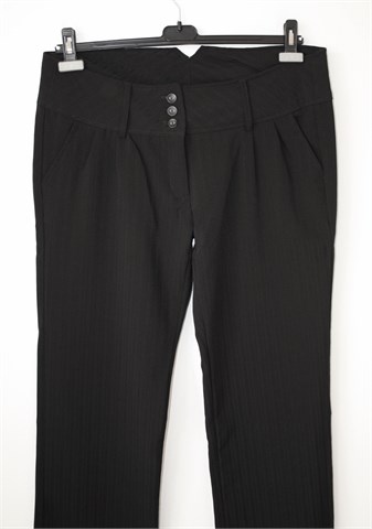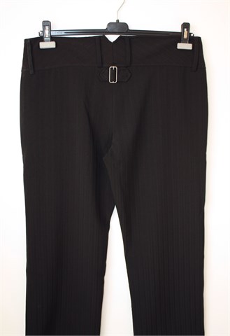 Identic hlače crne boje sa diskretnim prugama, materijal je blago sjajan. Prednji cif i kopčanje na tri gumbića, šira pasica za remen. Prednji bočni džepovi, ukrasne faldice ispod pasice. Lagan i rastezljiv materijal.