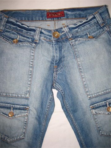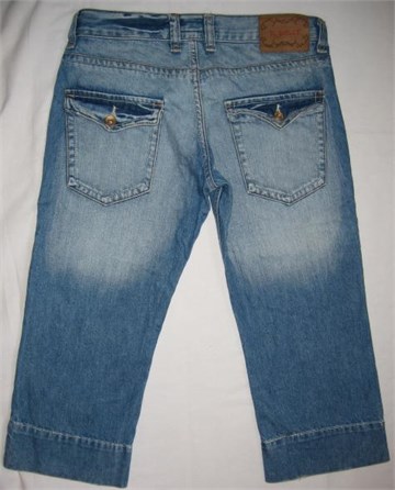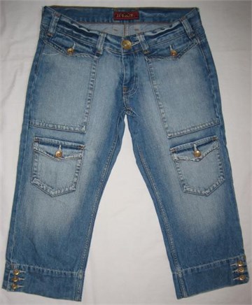 Nerastezljive, poluduge (3/4), 6 džepova (4 prednja i 2 stražnja), ukrasni gumbići na mandžetama. Ispranog izgleda, niski struk. Nošene malo, očuvane.