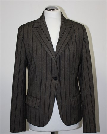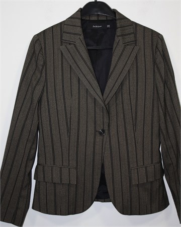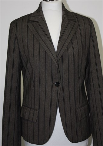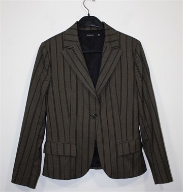In Wear sako/blazer crno-smeđe boje sa prugama. Prednje kopčanje, bočni džepovi sa preklopom (malo oštećenje na rubu džepa ali ne vidi se od preklopa). Blagi jastučići u ramenima, podstavljen.
