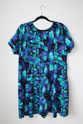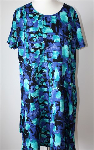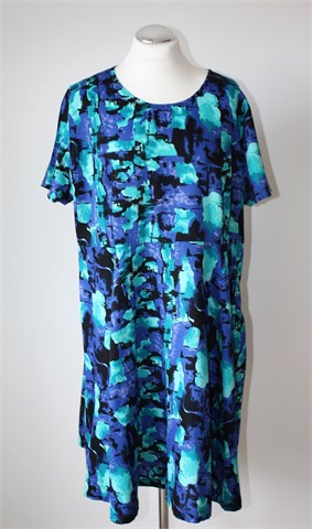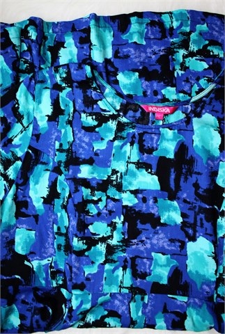 Indiska haljina sa kratkim rukavima, prošarano zeleno-plavo/ljubičasto-crne boje (boje i uzorak printa vidljivi na slikama). Bočni cif, nije rastezljiva. Tanja i lagana.