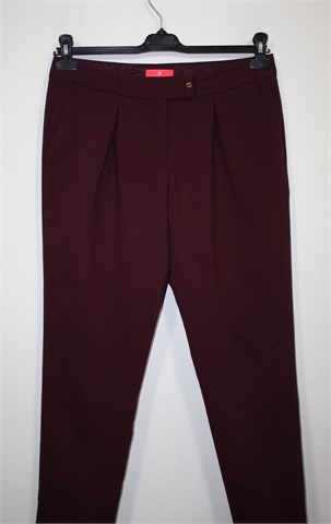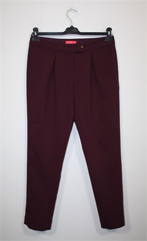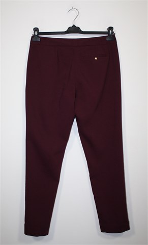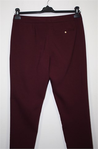 Ivanka Trump dizajnerske hlače tamno crvene/bordo boje. Prednji cif i kopčanje, ukrasni zlatni gumbić na pasici i na stražnjem džepiću. Prednji ušitci i bočni džepovi. Blago rastezljive. Šire oko bokova, uže u nogavicama (vidjeti mjere).