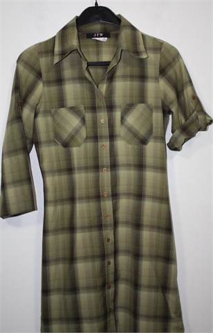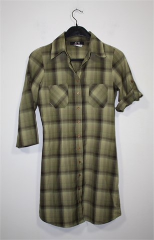 J.F.W. dugačka košulja/tunika zelene boje sa karirano-prugastim uzorkom. Prednje kopčanje, džepići na prsima. Rukavi se mogu nositi i kao kraći (kao jedan na slici). Tanji i mekan pamuk.