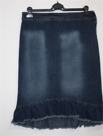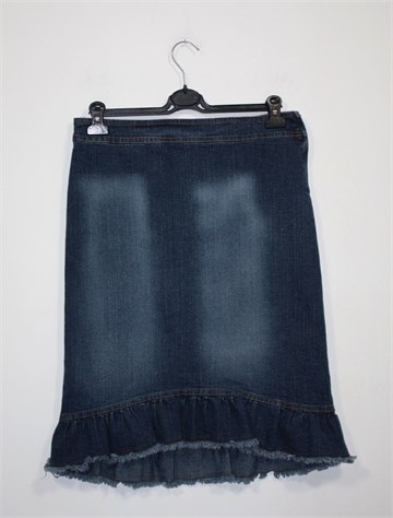 J.J. Scott traper suknja srednje plave boje mjestimično ispranog izgleda. Bočni cif, volančić na dnu suknje (ocufani rubovi). Stražnja strana je nešto duža (vidjeti mjere i sliku). Blago rastezljiva.