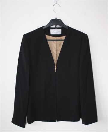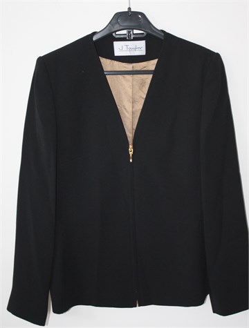 J. Taylor sako/jakna crne boje, podstava je zlatno-bež boje. Prednje kopčanje sa cifom (zlatnim), blago strukirana. Jastučići u ramenima.