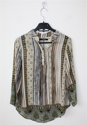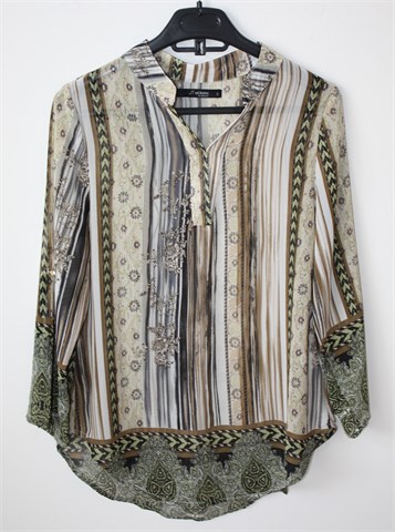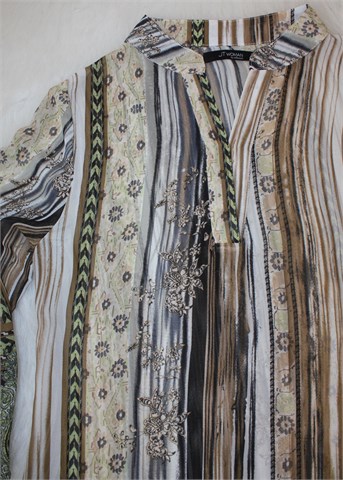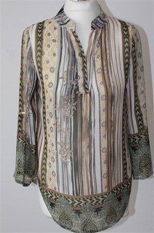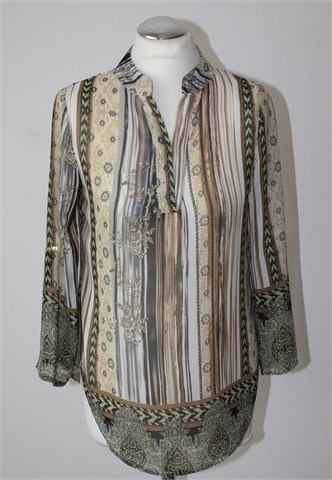 JT Woman by Colloseum bluza sa poludugim rukavima (mogu se nositi i kao kraći - vezica unutar rukava i gumbić sa vanjske strane rukava), šareni uzorak (boje i uzorak vidljivi na slikama). Tanja i lagana, providna. Nije rastezljiva. Na dnu oblo krojena (vidjeti mjere za bočnu i dužinu na sredini bluze).