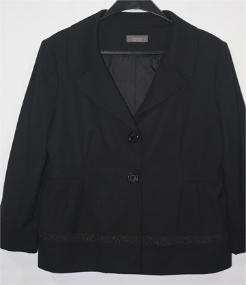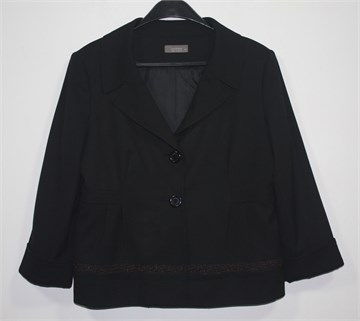 Jacqui.e sako ili blazer crne boje sa diskretnim uzorkom na tkanini, rukavi su poludugi. Prednje kopčanje, bočni zašiveni džepovi. Ukrasna heklana traka smeđe boje (malo iznad pasice). Podstavljen, blagi jastučići u ramenima.