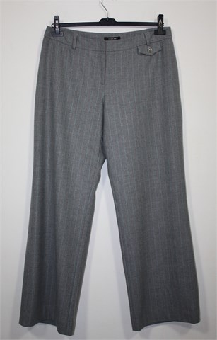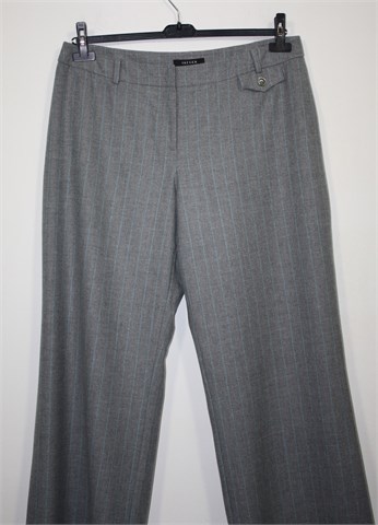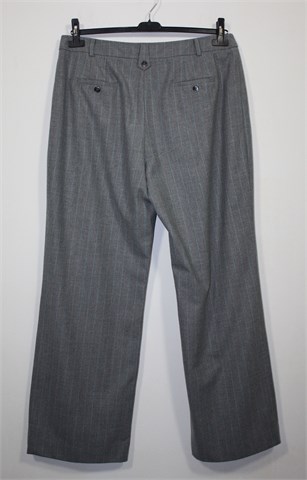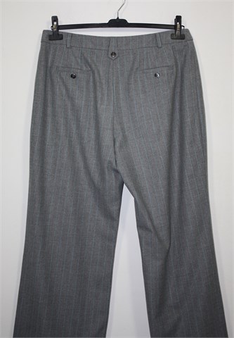 Dizajnerske Jaeger vunene hlače sive boje sa svijetlo plavim prugama. Prednji cif i kopčanje, pasica za remen. Prednji ukrasni džepić i stražnji skriveni džepovi sa gumbom. Podstavljene (skoro cijelom dužinom), tanji i mekan vuneni štofasti materijal.