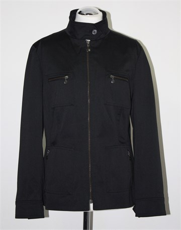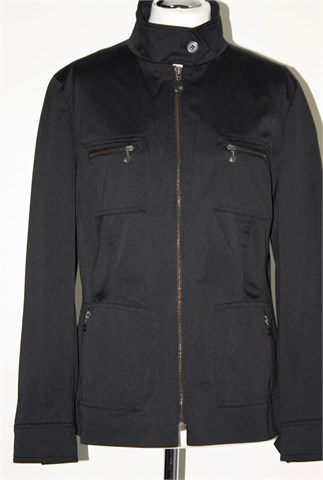 Jakna crne boje, materijal je gladak i blago sjajan. Prednje kopčanje sa cifom, bočni džepovi i džepovi na prsima (svi sa cifom). Podstavljena. Lagana jakna idealna za prijelazno vrijeme.