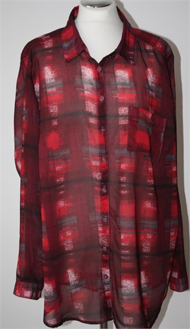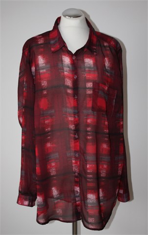 Janina košulja sa dugim rukavima, bordo-crvene boje sa printom (boje i uzorak printa vidljivi na slikama). Prednje kopčanje, džepić na prsima. Tanja i lagana, providna. Nije rastezljiva, malo duža sa stražnje strane.