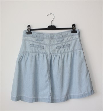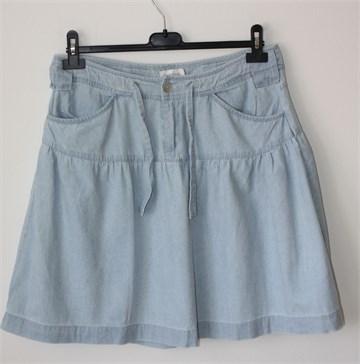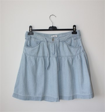 Janina Denim traper suknja svijetlo plave boje. Prednji cif i kopčanje, pasica za remen i vezica unutar pasice. Prednji bočni džepovi, stražnji ukrasni/lažni. Tanji traper, nije rastezljiv.