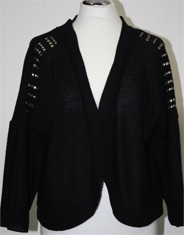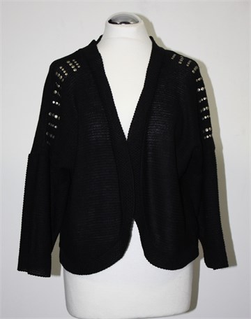 Janina vestica bez kopčanja crne boje, na ramenima aplikacije. Širi, poludugi rukavi (spuštena ramena), komotniji model (vidjeti mjere). Tanje i rastezljivo, blago rupičasto pletivo.