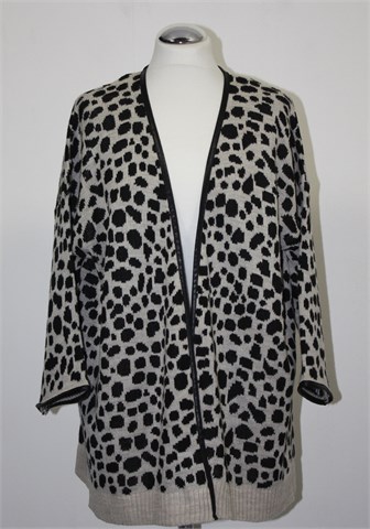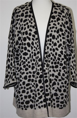 Janina vesta sa poludugim rukavima, svijetlo bež-crne boje (uzorak u pletivu kao na slikama). Nema kopčanje, na rub rukava i prednji obrub našivena je crna ukrasna traka (blago sjajna - djeluje kao umjetna koža). Pletivo je mekano i rastezljivo, srednje debljine. Nema bočnih šavova i ramena su otpuštena pa je odlična i kao oversized vesta za manje brojeve ili uža vesta za veće veličine - vidjeti mjere.