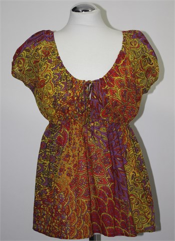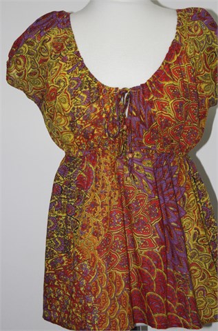 Jasmine bluza sa kratkim rukavima i šarenim printom (boje i uzorci kao na slici). Rastezljive gumice na krajevima rukava i oko otvora dokoltea. Ispod prsiju (i na leđima) prošivena je gumica pa je širina dosta prilagodljiva (vidjeti mjere). Gornji dio je podstavljen pamučnim materijalom. Lagana i prozračna.