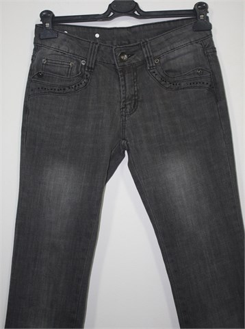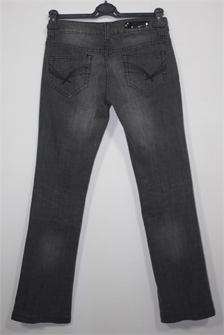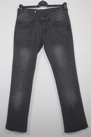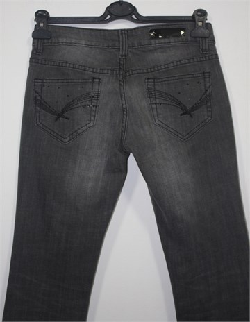 Jeans traper hlače sive boje, mjestimično ispranog izgleda (tvornički). Prednji cif i kopčanje, pasica za remen. Prednji i stražnji džepovi (ukrašeni crnim ukrasima - par ih je ispalo). Blago rastezljive, skraćivane.