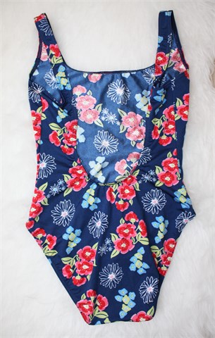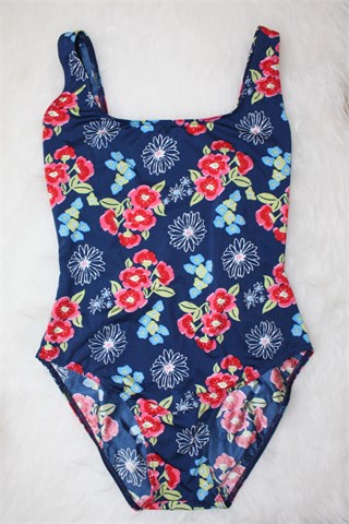 Jednodjelni kupaći kostim tamnije plave boje sa šarenim cvjetnim printom (boje i uzorak printa vidljivi na slikama).