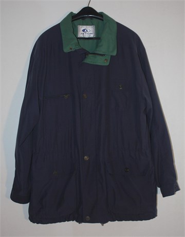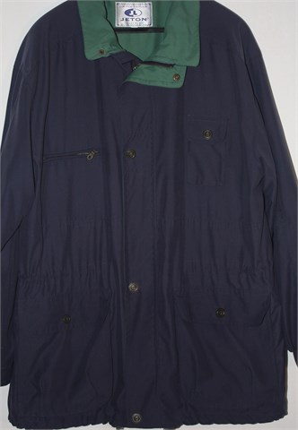 Jeton jakna plave boje sa zelenim detaljima. Prednji cif i kopčanje sa drukerima, džepovi sa drukerima sa svake strane i džepovi na prsima. Lagana, tanje podstavljena (podstava je kod pazuha malo oštećena ali ne smeta kod nošenja).