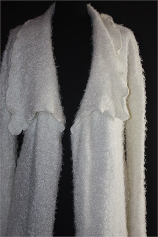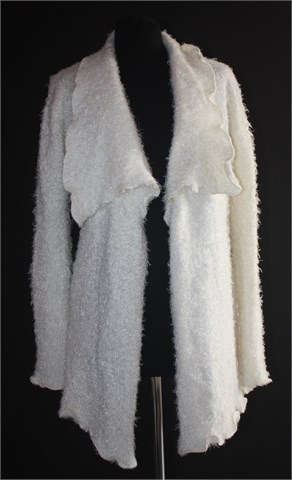 Jinda duža vesta/otvoreni kardigan bijele boje. Debelo, toplo i mucasto pletivo. Nema kopčanje pa je širina prilagodljiva (odgovarati će navedenim veličinama).