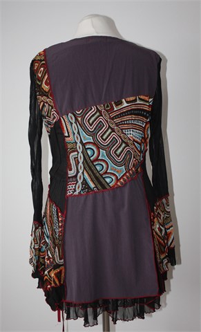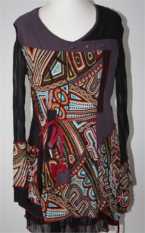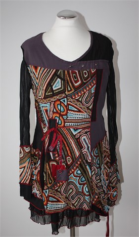 Joe Browns tunika sa šarenim uzorkom (boje i uzorci vidljivi na slikama). Kombinacija glatkog i mrežastog materijala (rukavi su cijeli od mrežastog materijala, providni). Podstavljena (osim rukava), na dnu podstave našivena su dva reda volančića. Rastezljiva, bočni cif.