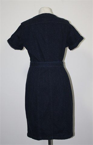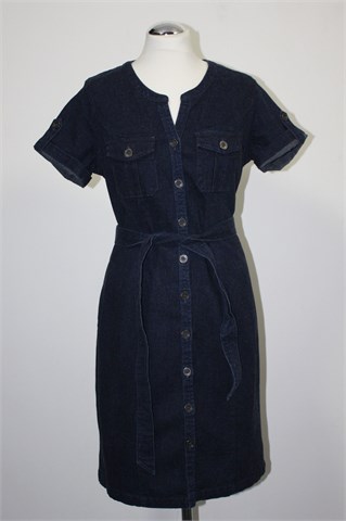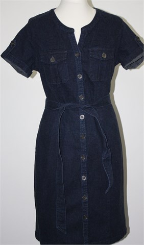 John Baner traper haljina sa kratkim rukavima, tamno plave boje. Prednje kopčanje sa gumbima, džepovi sa preklopom i gumbom na prsima. Bočne ušice za remen sa pripadajućim remenom od istog materijala. Strukirana, rastezljiva. Deblji i mekan traper.