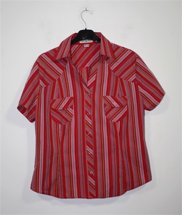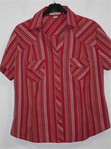 John F. Gee košulja sa kratkim rukavima, crvene boje sa šarenim prugama (kao na slici). Prednje kopčanje sa drukerima, mali džepići sa preklopom i drukerom na prsima. Blago strukirana, rukavići se mogu nositi i kao kraći (vanjski gumbić i vezica unutar rukava).
