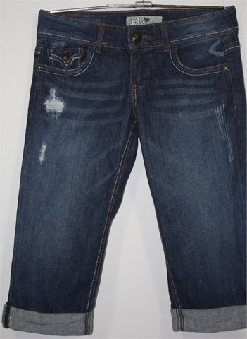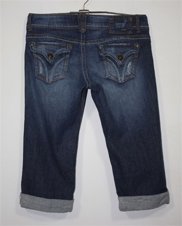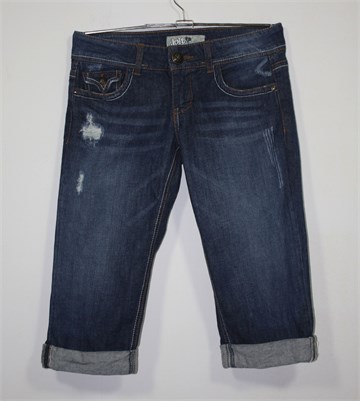 Jolt poluduge traper hlače, srednje plave boje mjestimično ispranog, iscufanog i podrapanog izgleda (tvornički used look). Prednji cif i kopčanje, pasica za remen. Prednji i stražnji džepovi (stražnji na preklop sa gumbom). Blago rastezljive.
