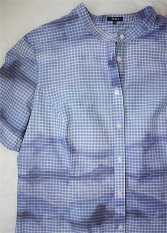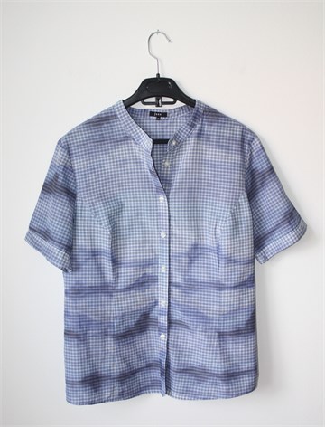 Jones košulja sa kratkim rukavima, plave boje sa kockastim uzorkom i mjestimično prošaranim dijelovima (vidljivo na slikama). Prednje kopčanje, blago strukirana. Tanja i lagana, nije rastezljiva.