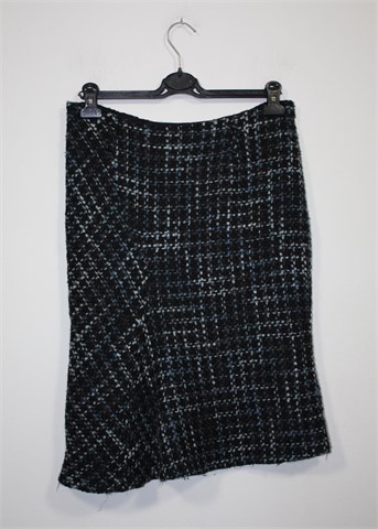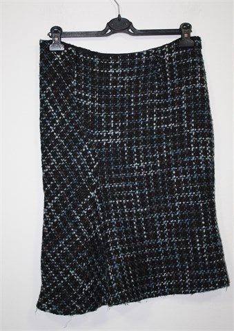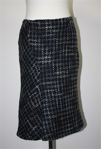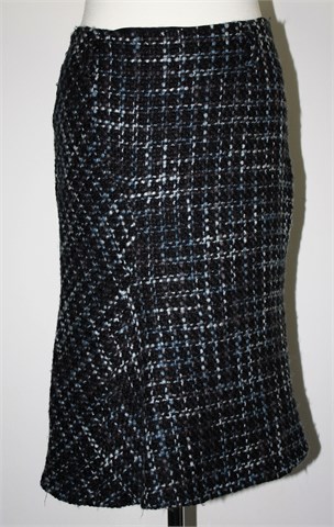 Jones suknja crne boje s prugastim upletenim uzorkom (boje kao na slici - par nijansa plave i sive). Bočni cif, ušice za remen (jedna se malo odšila ali bez problema se može zašiti), podstavljena. Deblja i mucasta, blago rastezljiva.