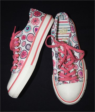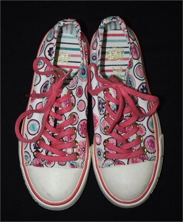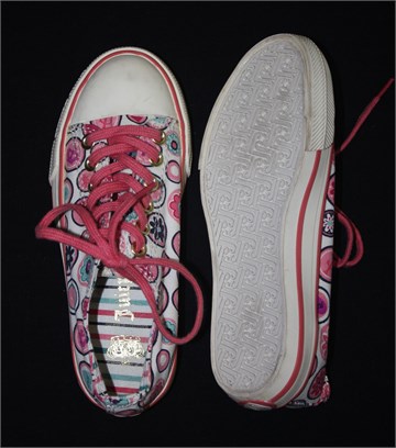 Juicy Couture platnene tenisice, bijele boje sa šarenim uzorkom (iznutra prugaste). Gumeni džonovi i kapica, obrubljene rozom bojom. Rozi žniranci.