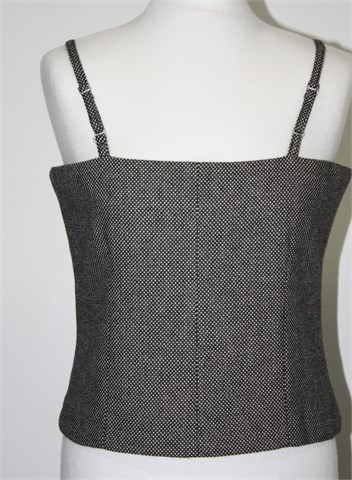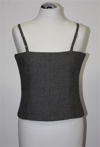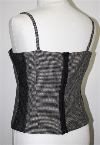 Juliete topić od tvida, prošarano crno bijele boje. Sa stražnje strane na sredini kopčanje sa kopčicama (kao korzet), bočne ukrasne trake od čipke. Materijal je tvid/štof, topić je podstavljen i ima ušitke. Naramenice su podesive.