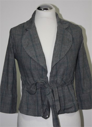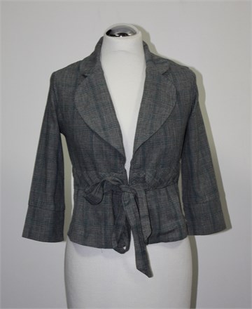 K-mode kraća jaknica/sako sa poludugim rukavima, prošarano crno-bijele boje s uzorkom pa djeluje sivo, protkana plavim nitima. Vezanje sa prednje strane (vezice se mogu stegnuti). Prorez na kraju svakog rukava, tanji i blago rastezljiv pamuk.