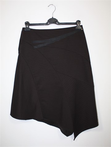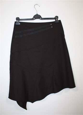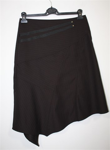 Kaffe suknja od štofa, tamno smeđe boje sa diskretnim svijetlim prugama. Bočni cif, podstavljena. Asimetrične dužine (vidljivo na slikama - vidjeti mjeru za dužinu - mjerena na najkraćem i najdužem dijelu).