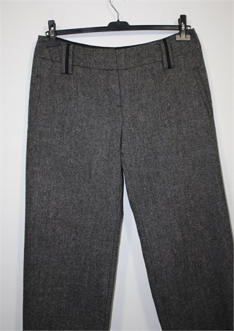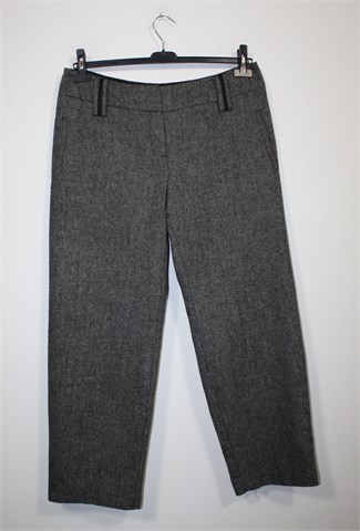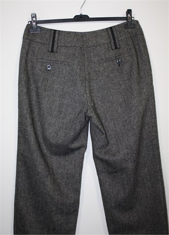 KappAhl hlače prošarano crno-bijele boje (djeluju sivo). Prednji cif i kopčanje, široka pasica za remen. Prednji bočni, stražnji ukrasni džepići sa gumbom. Podstavljene do cca pola dužine, tople.