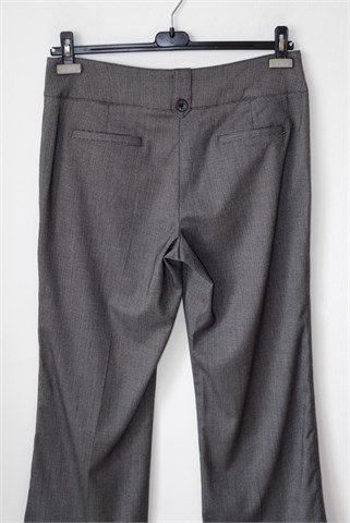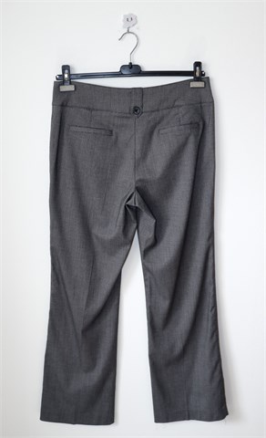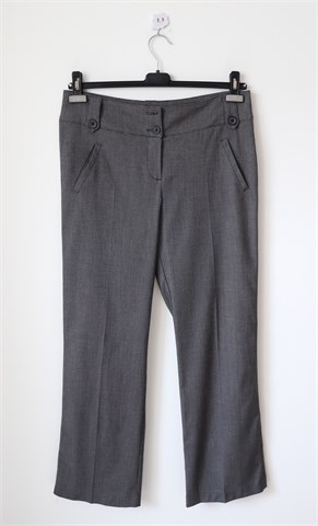 KappAhl hlače u kombinaciji crne i bijele boje (sitan uzorak na materijalu, djeluju prošarano sivo). Prednji cif i kopčanje (jedan gumb se odšio), pasica za remen. Prednji bočni, stražnji ukrasni/lažni džepovi. Blago rastezljive.