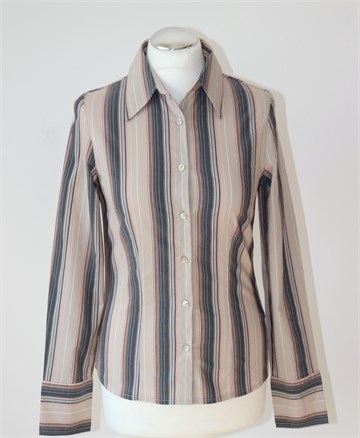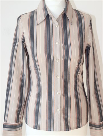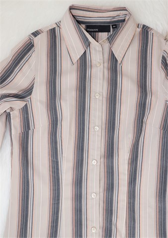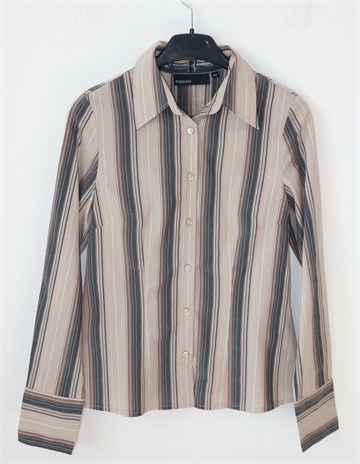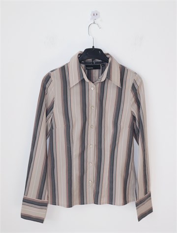 KappAhl košulja sa dugim rukavima, svijetlo sivo-bež boje sa prugama (boje vidljive na slikama). Prednje kopčanje, blago strukirana. Rastezljiva.