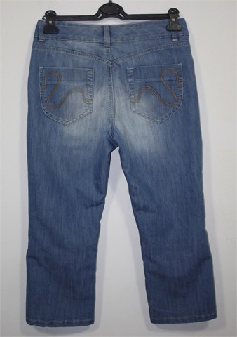 KappAhl poluduge traper hlače, svijetli traper mjestimično ispranog izgleda (tvornički used look). Prednji cif i kopčanje, pasica za remen. Prednji i stražnji klasični džepovi (stražnji ukrašeni prošivima od konca). Na dnu nogavica bočni gumbi.