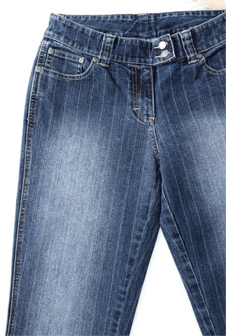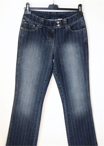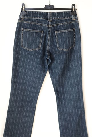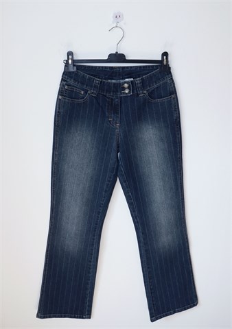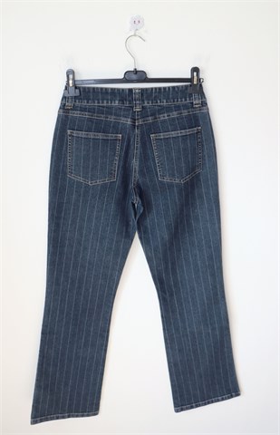 KappAhl traper hlače srednje plave boje sa svijetlim isprekidanim prugama, mjestimično ispranog izgleda. Prednji cif i kopčanje, pasica za remen. Prednji i stražnji klasični džepovi. Rastezljive.