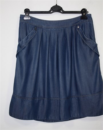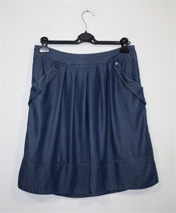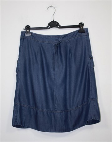 Karla suknja plave boje, materijal je kao traper samo je puno tanji i laganiji i vrlo blago sjajan. Prednji bočni džepovi, stražnji cif i gumbić (gumbić je malo pomaknut da bude uža u struku ali lako se zašije na željenu širinu).