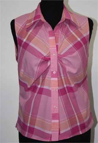 Katan košulja bez rukava, većinom roze boje sa uzorkom i detaljima kao na slici. Prednje kopčanje, lagano strukirana. Blago rastezljiva.