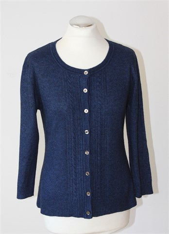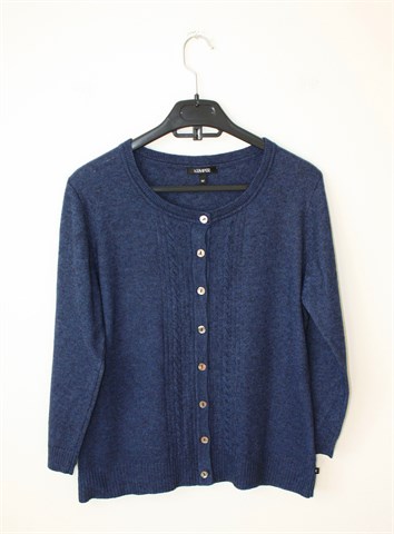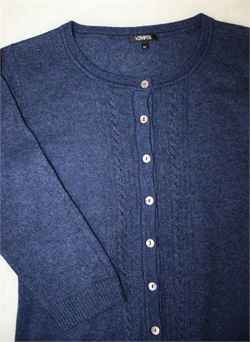 Kemper vesta/kardigan sa poludugim rukavima, prošarano plave boje. Prednje kopčanje, rastezljiva. Tanje pletivo.